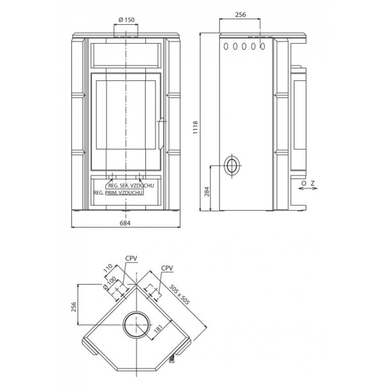 Kamna jsou s lomeným sklem určené do rohu místnosti.