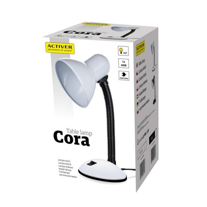 Stolní lampa CORA je vhodná pro doplňkové osvětlení v dětských pokojích, pracovnách a kanceláří. Lampa má ohebný krk, čímž ji lze nastavit do mnoha úhlů svícení. Lampa má vlastní vypínač úmístěný na podstavci. Lampa je určena pro žárovky se závitem E27, bílá barva. Žárovka není součástí balení.Výška (cm):34