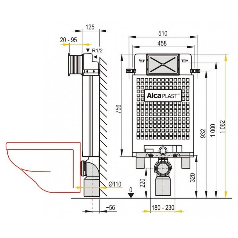 ALCAPLAST Alcamodul - předstěnový instalační systém pro zazdívání A100/1000 - stavební výška 1 mrozměr - karton 480×1050×140 mm