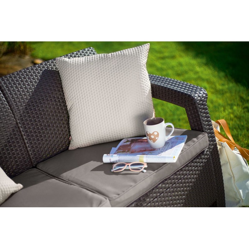 Zahradní dvojmístná pohovka CORFU LOVE SEAT vás nadchne svým nevšedním designem v imitaci přírodního ratanu. Konstrukce je přitom pevná a vydrží běžné zatížení venkovního provozu. Velkou výhodou je i jednoduchá údržba a snadné sestavení.