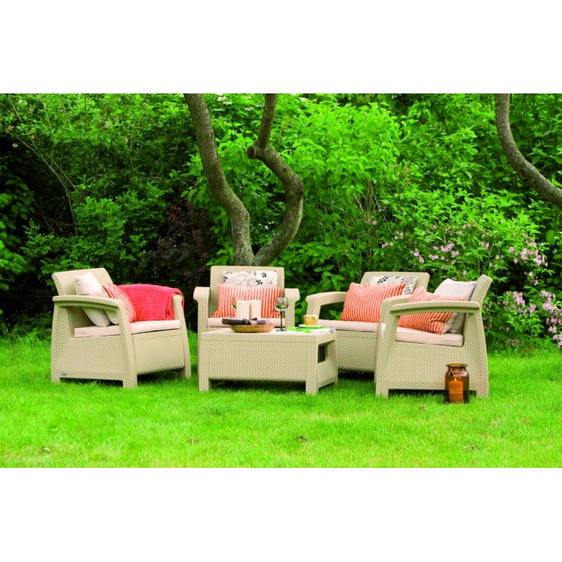 Souprava je vyrobena z lisovaného plastu v imitaci plochého ratanu.