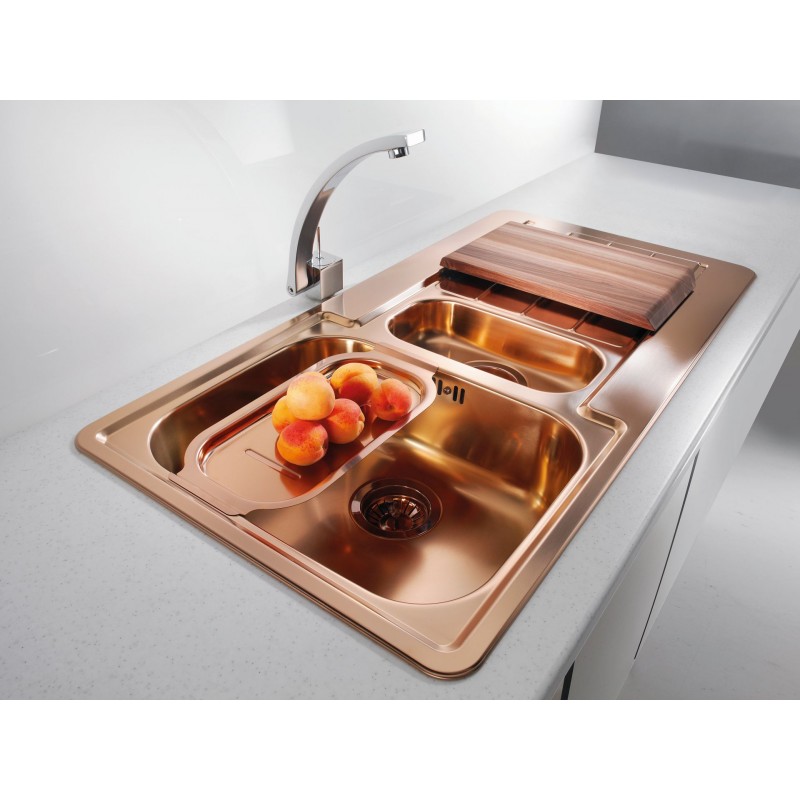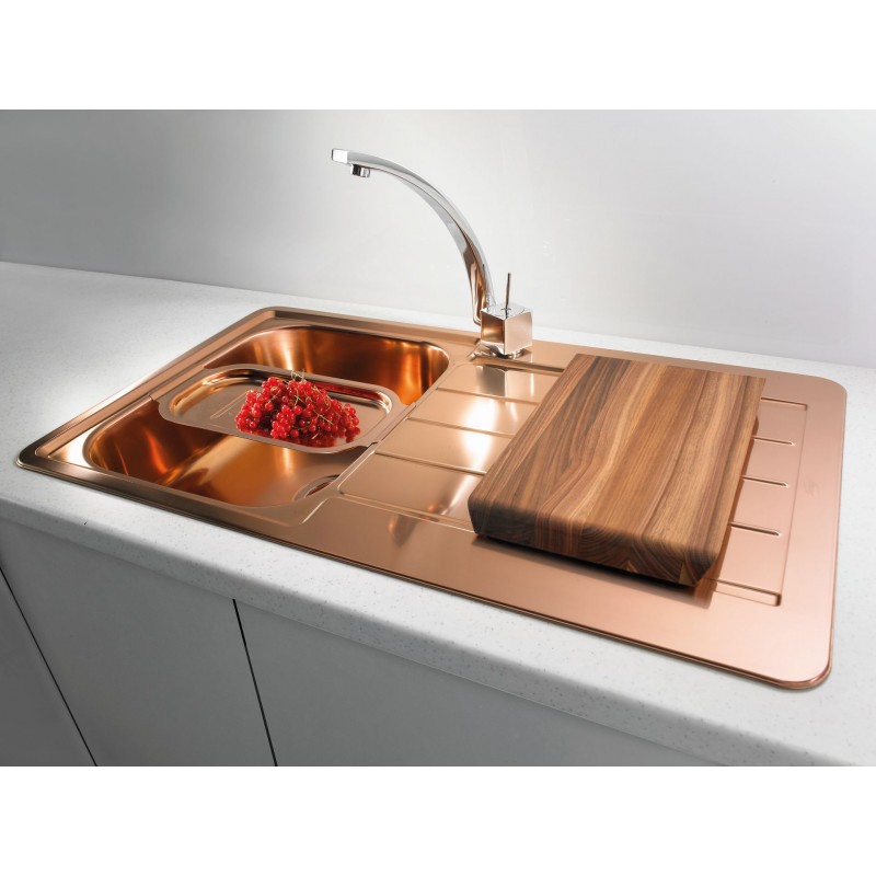 Řady dřezů značky Alveus byly rozšířeny o skupinu kuchyňských dřezů řady Monarch, která je dostupná ve třech rozdílných nerezových provedeních. Ve vaší kuchyni se mohou nyní zářivě vyjímat zlaté, měděné a antracitové varianty. Kovový lesk dřezu dodá vaší kuchyni nádech mystiky a díky speciální technologii akumulace je každý dřez unikátní. Atraktivitu a funkčnost dřezu umocňují doplňky jako dřevěná krájecí deska či nerezová miska.