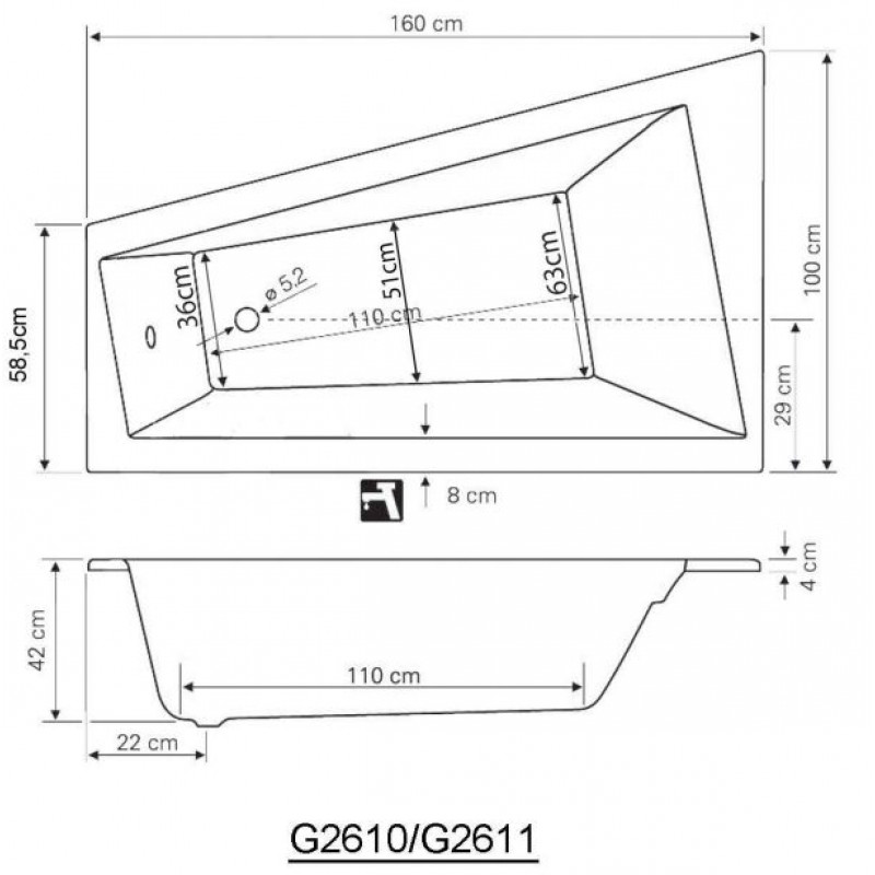 METUJE vana 160x100x42cm bez nožiček, pravá, bíláTechnické údaje