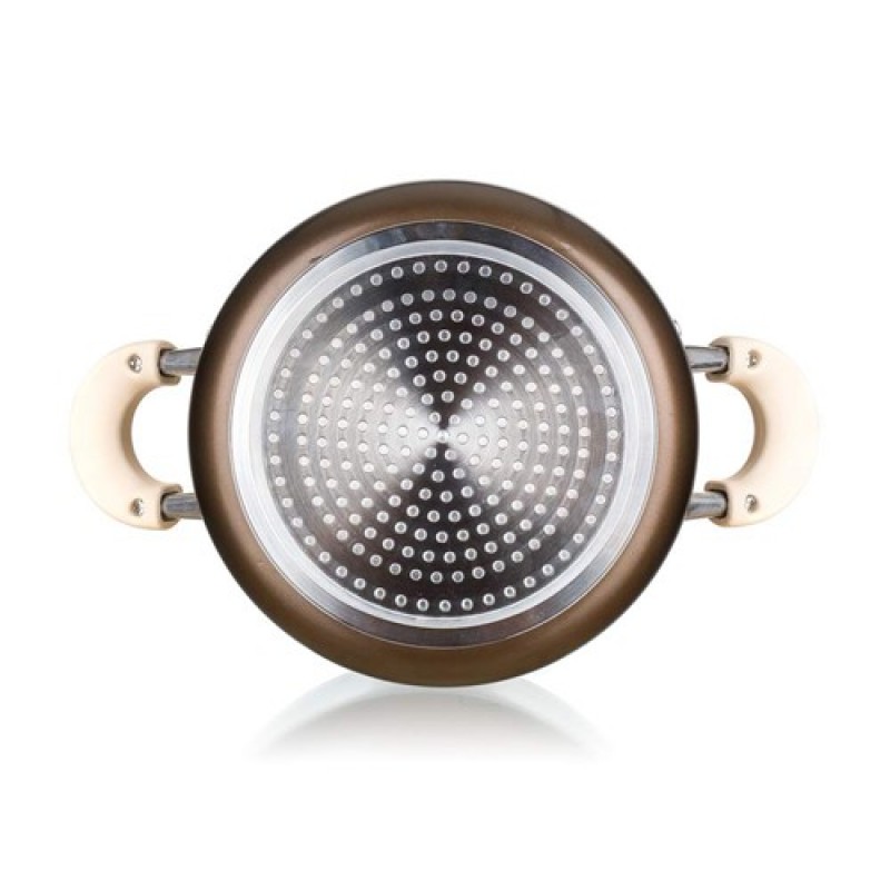 Hliníkový hrnec CONTRA 24 x 11 cm s nepřilnavým 2-vrstvým černým povrchem, s bílými silikonovými úchyty a skleněnou poklicí s bílým silikonovým knobem a silikonovým okrajem, objem 5 L. Hrnec je vhodný pro indukční vaření.Výška (cm):11