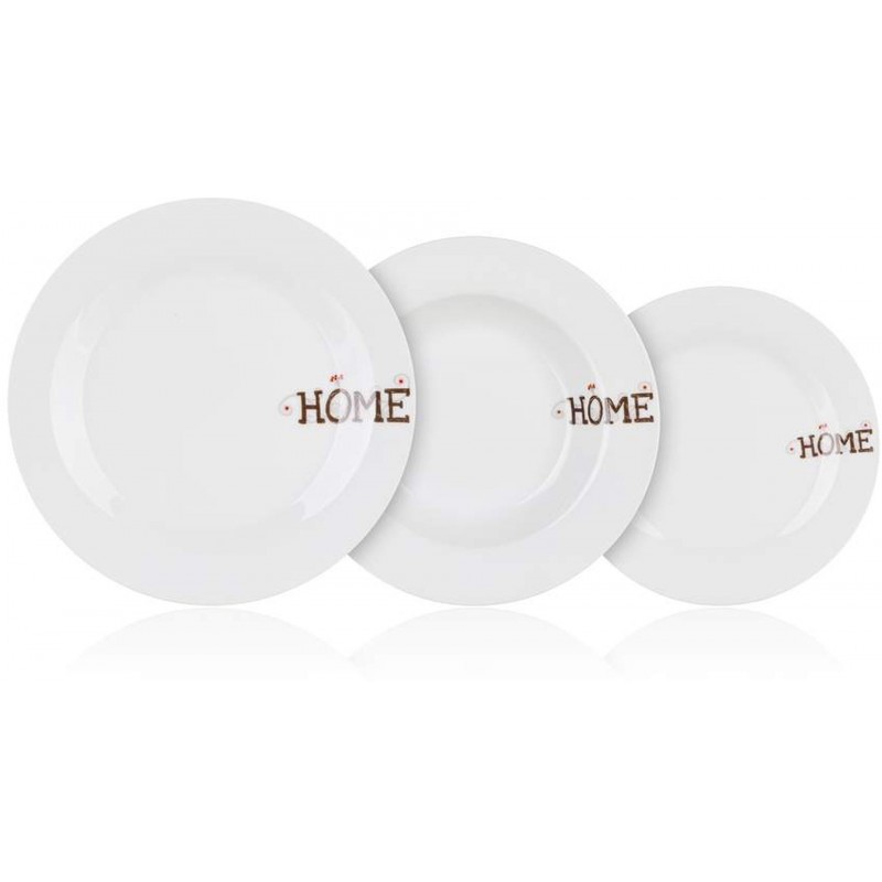 18dílná talířová sada v bílé barvě s dekorem HOME je vyrobena z porcelánu. Sada obsahuje: 6 x dezertní talíř 19 cm, 6 x hluboký talíř 21,5 cm a 6 x mělký talíř 24 cm. Talíře lze používat do mikrovlnné trouby a mýt v myčce na nádobí, ale ne na intenzivní programy, dekor je na glazuře. V nabídce máme další produkty z kolekce HOME.Parametry: