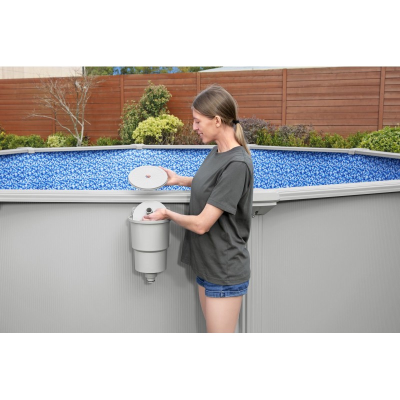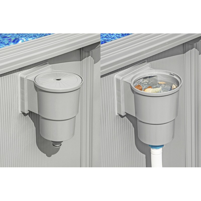 - Integrované sítko na plovoucí nečistoty zajišťuje ve spolupráci s filtračním systémem odstraňování nežádoucích nečistot a čistou vodu v bazénu
