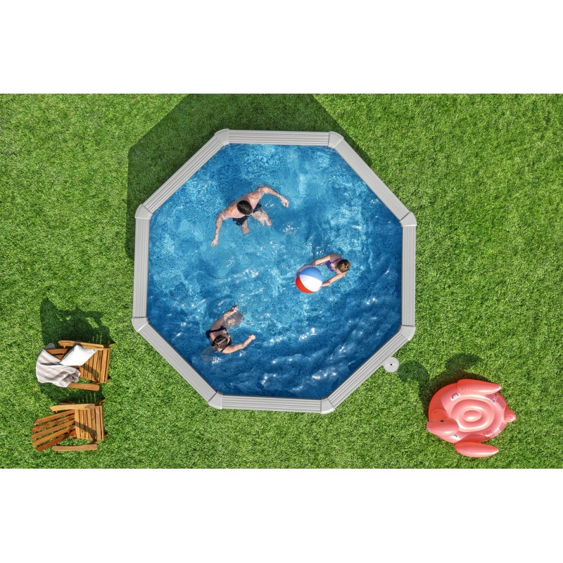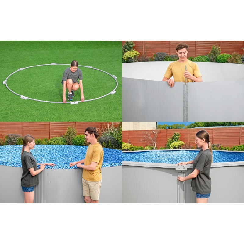 - Bazén lze snadno sestavit na pevném rovném povrchu, lze ho nechat sestavený po celý rok