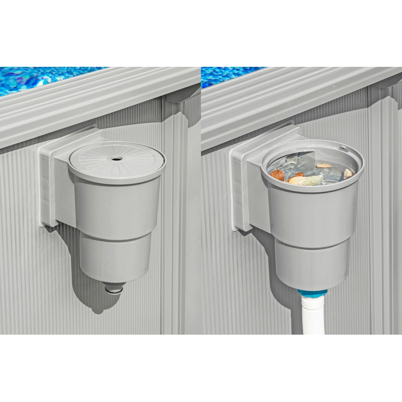 - Integrované sítko na plovoucí nečistoty zajišťuje ve spolupráci s filtračním systémem odstraňování nežádoucích nečistot a čistou vodu v bazénu