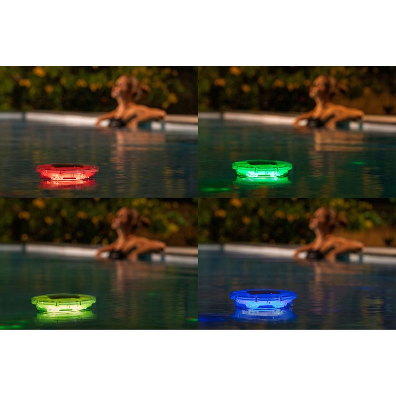 Plovák se solárním napájením automaticky rozsvítí po setmění a nabízí fascinující čtyřbarevné osvětlení s 3 světelnými efekty a 9 barevnými variantami (4 stálé a 5 kombinací). Díky vodotěsnému dálkovému ovládání můžete měnit režimy osvětlení až na vzdálenost 15 m. Solární akumulátor se nabíjí 7–10 hodin v závislosti na počasí a poskytuje světlo po dobu 6–8 hodin.