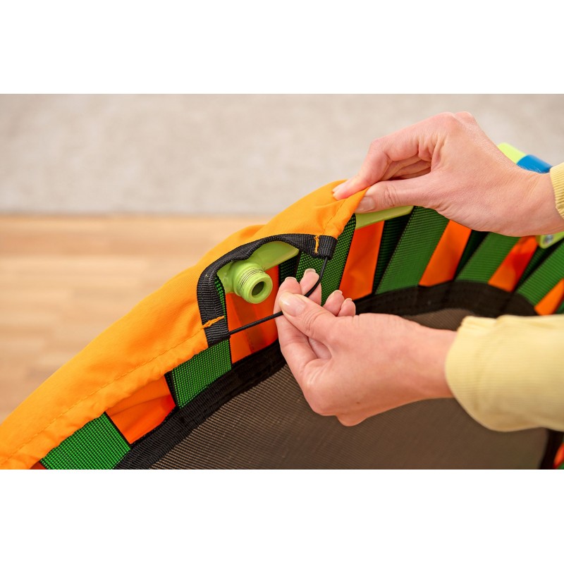 Trampolína zaujme stabilní a odolnou konstrukcí. Korozivzdorný ocelový rám s práškovou povrchovou úpravou zajišťuje dlouhou životnost a maximální bezpečí při skákání. Maximální nosnost 25 kg umožňuje bezpečný pohyb pro děti od 3 let. Odnímatelné stabilizační držadlo s měkkou pěnovou rukojetí poskytuje oporu a jistotu při každém skoku.