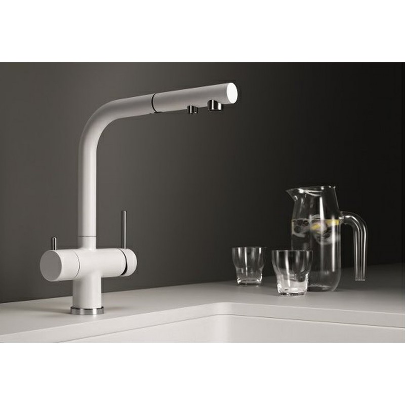 • komfortní 2-v-1-baterie s ovládáním vpravo pro teplou a studenou vodu a s ovládáním vlevo pro filtrovanou vodu• hygienická: oddělený tok vody a samostatná výpusť pro filtrovanou vodu - žádné smíchání s vodou z vodovodu