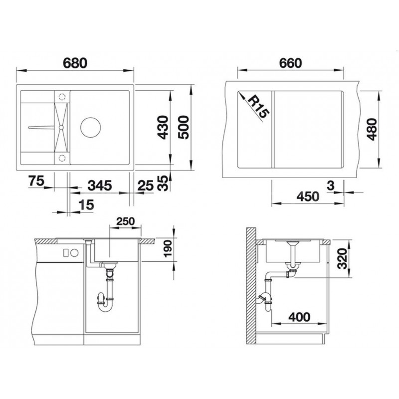 - odtoková armatura + zápachový uzávěr s odbočkou pro myčku nádobí