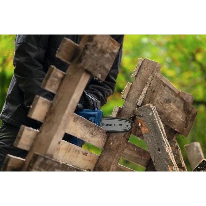 Prořezávací pila GKE 18V-15 Professional, která je schopna zvládnout až 350 řezů na jedno nabití, nabízí napínání bez použití nářadí pro rychlou výměnu řetězu Oregon. Má spoušť s proměnnou rychlostí pro kontrolu nad řezáním.