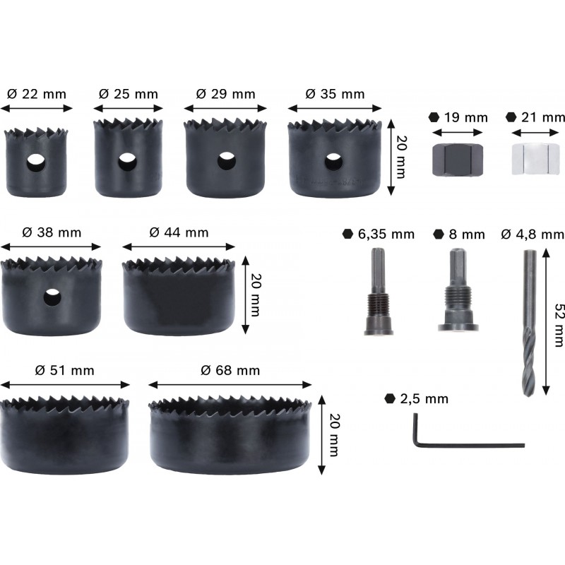 Sada děrovek s adaptérem na dřevo a sádrokarton se středicím vrtákem 22; 25; 29; 35; 38; 44; 51; 68 × 15 mm