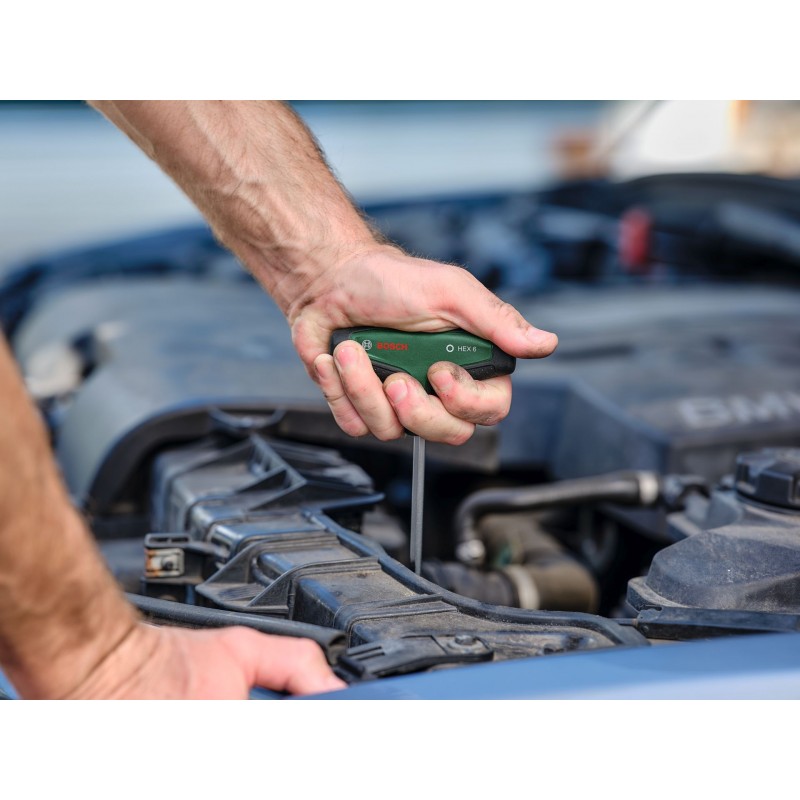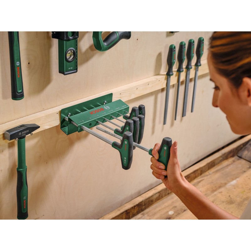 7dílná sada šestihranných šroubováků Bosch s T-rukojetí přináší větší pohodlí a flexibilitu při řešení domácích kutilských úkolů. Všechny šestihranné šroubováky s T-rukojetí (HEX2, HEX3, HEX4, HEX5, HEX6, HEX8, HEX10) jsou bezkonkurenční pro kontrolované a výkonné šroubování, a to i na těžko přístupných místech, při montáži nábytku nebo údržbě motocyklů a automobilů. Ergonomické dvousložkové rukojeti ve tvaru písmene T s velkými plochami měkkého úchopu jsou navrženy pro pohodlný a efektivní přenos síly při šroubování, a to i při vysokém krouticím momentu. Každý šroubovák s rukojetí tvaru písmene T je vybaven ocelovou hřídelí S2, která je nejlepší ve své třídě (56–60 HRC). Extra dlouhé dříky usnadňují přesnou práci v úzkých, těžko přístupných oblastech. Díky intuitivnímu ukazateli velikosti na rukojeti je snadné vybrat ten správný šroubovák pro každou práci. Dobře organizované šroubováky s rukojetí ve tvaru písmene T se dodávají v kovovém stojanu, který lze postavit nebo namontovat na stěnu.