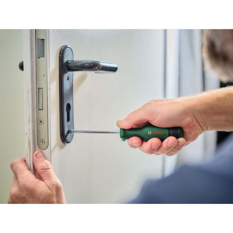 Zmákni jakoukoli šroubovací práci rychle a efektivně s vysoce kvalitním šroubovákem Bosch – navrženým s ohledem na špičkový výkon a vynikající pohodlí. Šroubovák má pochromovaný dřík z extra tvrdé oceli S2, který zajišťuje robustní krouticí moment: minimálně o 40 % nad normou (ISO 2380). Hrot šroubováku (58 ± 3 HRC) je pro stabilní šroubování magnetický a černé fosfátování zajišťuje lepší vizuální rozlišení. Dvousložková rukojeť má měkké úchopové plochy pro větší kontrolu a pohodlí. Šestihranná přední část rukojeti zabraňuje sklouznutí. Který šroubovák Bosch se hodí na kterou práci? Volba je snadná a rychlá díky barevně odlišenému označení velikosti a typu.