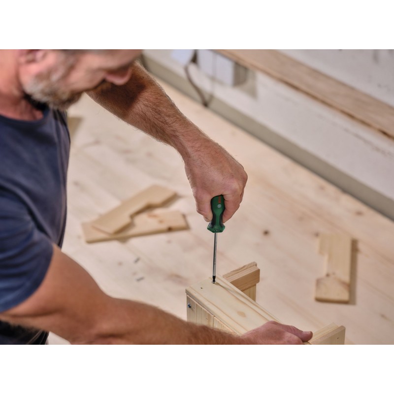 Zmákni jakoukoli šroubovací práci rychle a efektivně s vysoce kvalitním šroubovákem Bosch – navrženým s ohledem na špičkový výkon a vynikající pohodlí. Šroubovák má pochromovaný dřík z extra tvrdé oceli S2, který zajišťuje robustní krouticí moment: minimálně o 40 % nad normou (TMD-705). Hrot šroubováku (58 ± 3 HRC) je pro stabilní šroubování magnetický a černé fosfátování zajišťuje lepší vizuální rozlišení. Dvousložková rukojeť má měkké úchopové plochy pro větší kontrolu a pohodlí. Šestihranná přední část rukojeti zabraňuje sklouznutí. Který šroubovák Bosch se hodí na kterou práci? Volba je snadná a rychlá díky barevně odlišenému označení velikosti a typu.