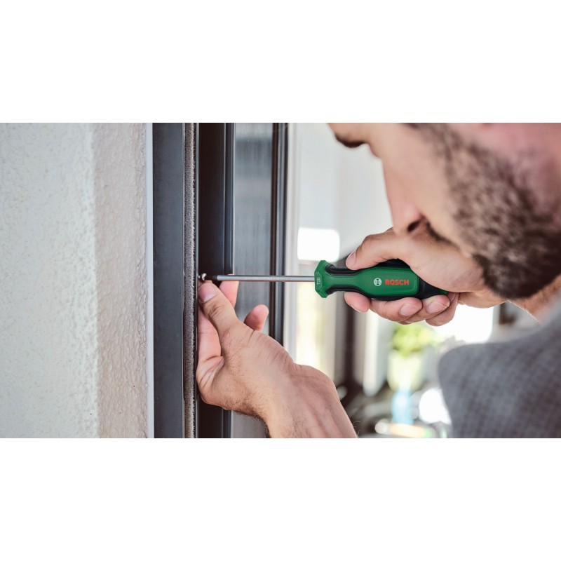 Zmákni jakoukoli šroubovací práci rychle a efektivně s vysoce kvalitním šroubovákem Bosch – navrženým s ohledem na špičkový výkon a vynikající pohodlí. Šroubovák má pochromovaný dřík z extra tvrdé oceli S2, který zajišťuje robustní krouticí moment: minimálně o 40 % nad normou (TMD-705). Hrot šroubováku (58 ± 3 HRC) je pro stabilní šroubování magnetický a černé fosfátování zajišťuje lepší vizuální rozlišení. Dvousložková rukojeť má měkké úchopové plochy pro větší kontrolu a pohodlí. Šestihranná přední část rukojeti zabraňuje sklouznutí. Který šroubovák Bosch se hodí na kterou práci? Volba je snadná a rychlá díky barevně odlišenému označení velikosti a typu.