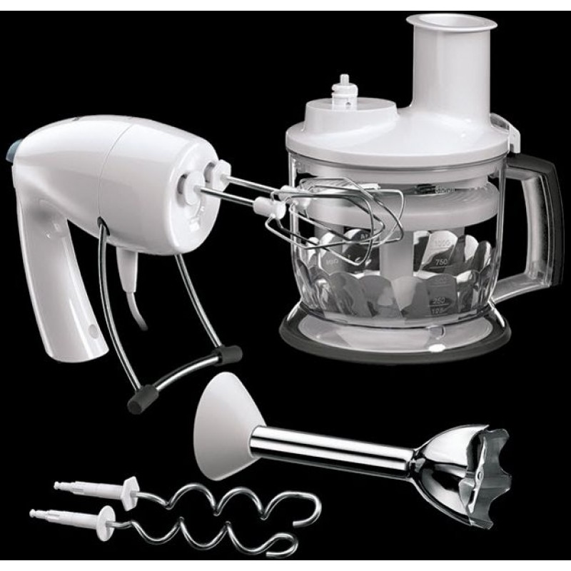 příslušenství: šlehač, hnětací metly, krájecí a strouhací nástavec, nůž na sekání