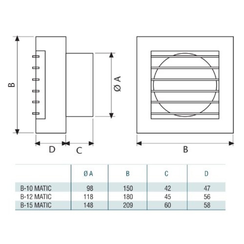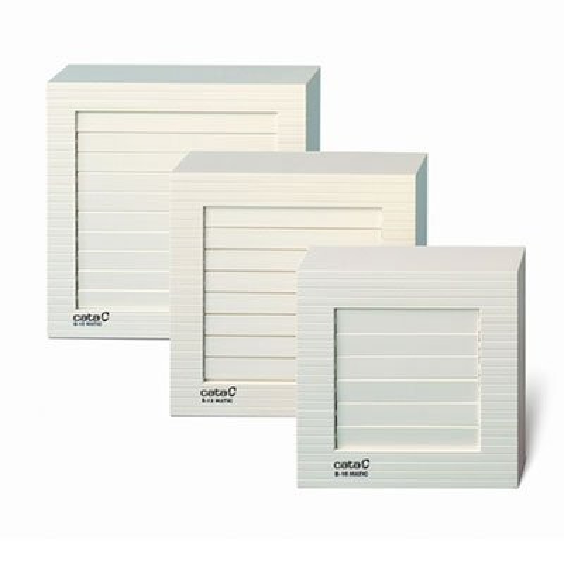 CATA B-10 MATIC T ventilátor axiální na zeď, do stropu či do okna 00916000Axiální ventilátor na zeď, do stropu či do okna, pr. 100 mm, 98 m3/h, 43 dB(A), 3 mmH2O (29 Pa), IPX4, žaluzie, doběhový časovač.