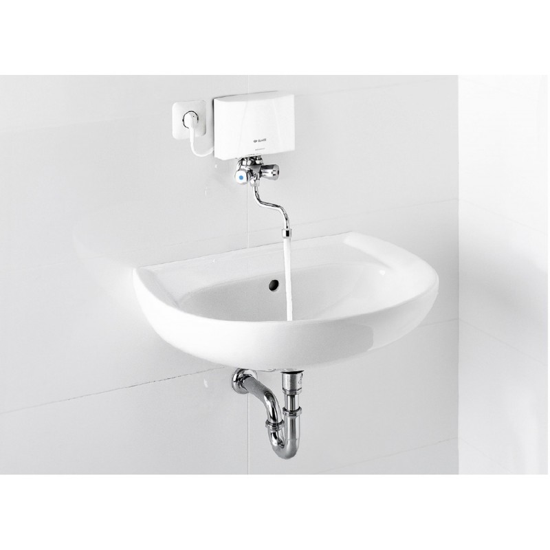CLAGE M7 SMB je hydraulicky řízený elektrický průtokový ohřívač vody o výkonu 6,5 kW, dodávaný jako kompletní sada s beztlakovou kohoutkovou baterií a otočným výtokovým ramínkem. Je určen pro instalaci nad umyvadlo nebo dřez a zajišťuje okamžitý ohřev vody bez zásobníku – voda je ohřívána přímo při průtoku.