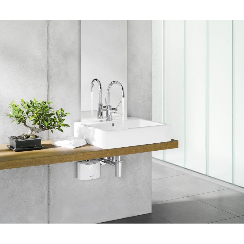 Voda je ohřívána přímo při průtoku bez zásobníku a bez pohotovostních ztrát. Elektronická regulace výkonu automaticky přizpůsobuje topný výkon aktuálnímu průtoku a vstupní teplotě vody a udržuje stabilní výstupní teplotu až do limitu výkonu přístroje. Instalace pod umyvadlem nebo dřezem minimalizuje tepelné ztráty v potrubí a snižuje spotřebu energie.