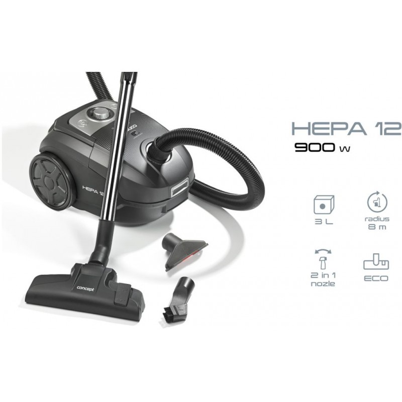 CONCEPT VP-8071 Sáčkový vysavač 900 W vp8071Podlahový sáčkový vysavač s příkonem 900 W a HEPA 12 v základní výbavě od české značky Concept