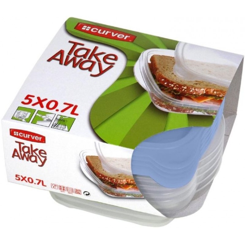 CURVER Sada dóz TAKE AWAY 5x 0,7 l, 16 x 16 x 11 cm, transparentní modrá, 08313-001Sada pěti dóz od značky Curver pro uskladnění potravin. Dózy lze použít v mikrovlnné troubě, mrazničce i chladničce a myčce nádobí.
