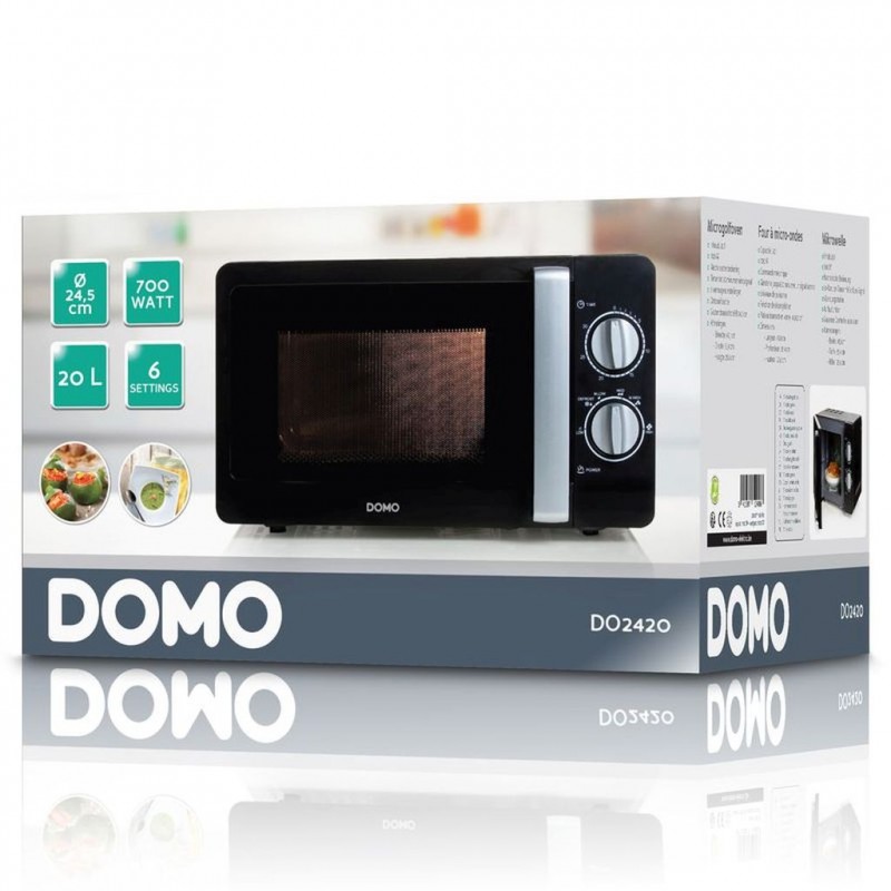 DOMO Mikrovlnná trouba DO2420Volně stojící elegantní mikrovlnná trouba v černé barvě s jednoduchým mechanickým ovládáním s časovačem a 6 stupni výkonu.