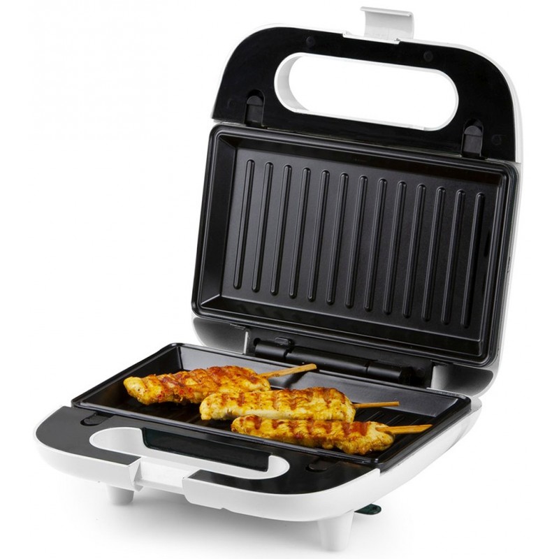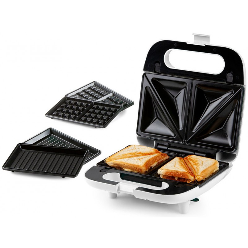 Praktický toustovač s výměnnými deskami představuje 3 produkty v 1: sendvičovač na trojúhelníkové sendviče, vaflovač a gril na přípravu panini, masa, či grilované zeleniny. Díky snadné a rychlé výměně desek budete mít vždy po ruce jeden z těchto tří přístrojů. Na plné nahřátí počkáte jen 3 minuty a můžete začít s přípravou vaší oblíbené svačinky. Nahřátí na provozní teplotu pak signalizuje kontrolka na víku přístroje. Následnou údržbu pečících desek vám usnadní nejen možnost je vyjmout z toustovače a omýt přímo pod tekoucí vodou, ale také jejich nepřilnavý povrch. Tepelně izolovaná rukojeť a protiskluzové nožičky se spolu postarají o to, abyste se při přípravě svačiny nepopálili, nebo vám toustovač nesklouzl po pracovní desce. Toustovač lze díky zámku víka a rovné zadní části uschovat do skříňky i ve svislé poloze a ke smotání přívodního kabelu vám dobře poslouží k tomu připravené úchyty na spodní části přístroje.