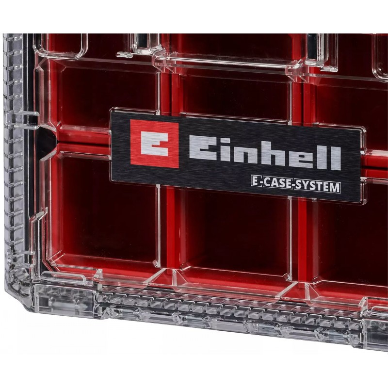 Třídicí box Einhell E-Case Half-size je součástí modulárního systému E-Case – perfektně kombinovatelný, stohovatelný a přizpůsobitelný individuálním požadavkům. Šrouby, hmoždinky nebo jiné drobné díly: vše je přehledně uloženo ve třech malých a jednom velkém třídicím boxu se dvěma přepážkami. Díky integrovanému uzamykacímu systému lze třídicí box bezpečně připojit ke kufrům E-Case Half-size a ke všem kufrům E-Case vybaveným zámky Half-size. Pro kompatibilitu se standardními kufry E-Case je lze kombinovat s adaptérní deskou E-Case (prodává se samostatně). Průhledné víko zajišťuje neustálý přehled a ergonomické madlo pohodlnou přepravu. Robustní box lze zatížit až 12,5 kg a lze jej osadit visacím zámkem jako ochranu proti krádeži. Součástí dodávky je třídicí box E-Case Half-size se čtyřmi vložkami. Další komponenty E-Case jsou k dispozici samostatně.