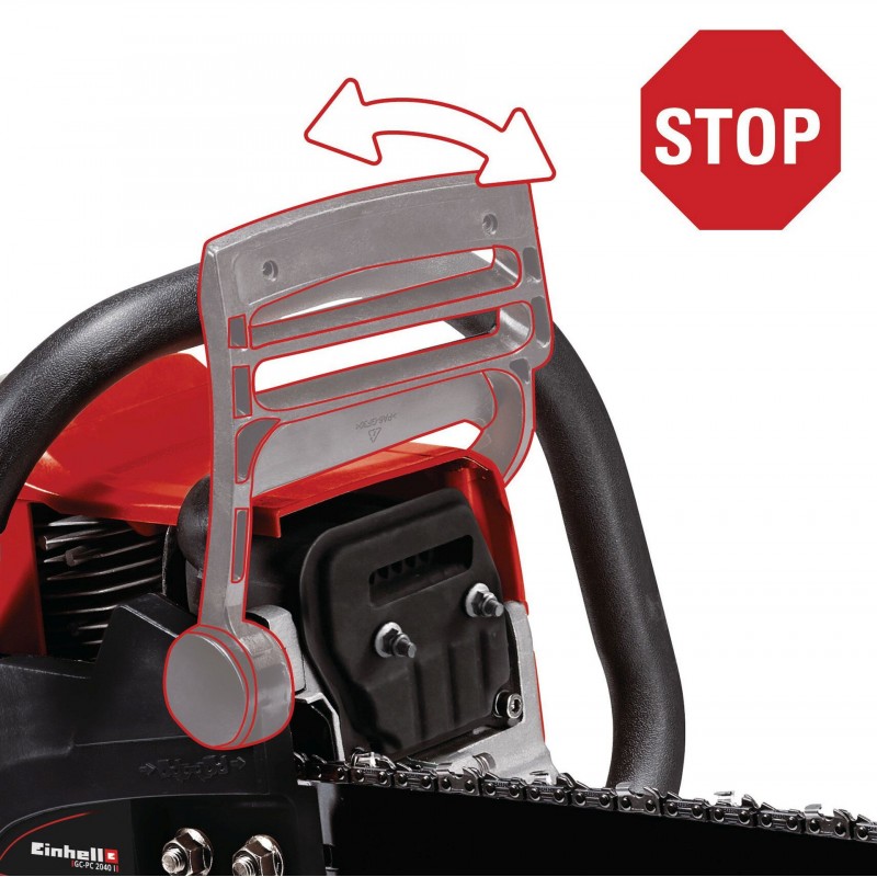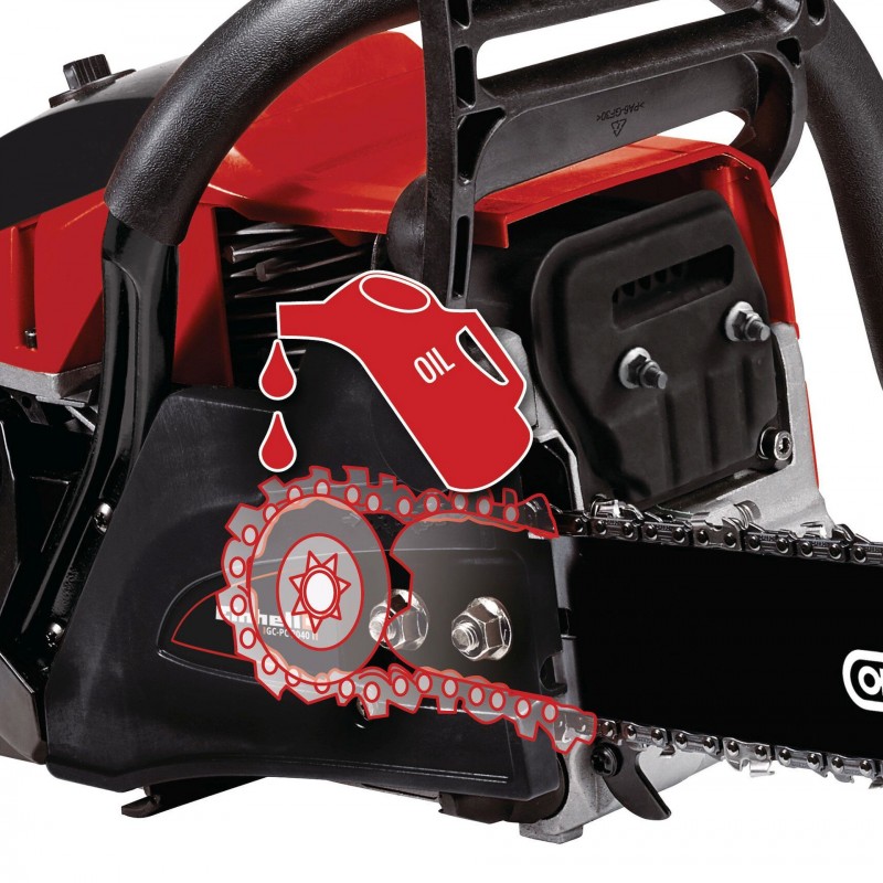 Benzínová řetězová pila Einhell GC-PC 2040 I kombinuje výkon s ostrostí a bezpečnost se snadnou manipulací. Kombinace kvalitní benzínové řetězové pily Einhell a kvalitní lišty a řetězu OREGON zajišťuje, že zahrádkáři stojí po boku silný a spolehlivý partner. Ať už na zahradě, na dvoře nebo v dílně: benzínová řetězová pila je univerzál pro jednoduchou a hrubší práci se dřevem. Vzduchem chlazený dvoutaktní motor s klikovou hřídelí s ložisky po obou stranách je silným pohonem a poradí si dokonce i s nepoddajným dřevem: Větve a hranoly, obrobky a palivové dříví proti benzínové řetězové pile nic nezmůžou. Díky celé řadě technických podpůrných funkcí je manipulace s benzínovou řetězovou pilou od Einhell snadná a bezpečná. Antivibrace tlumí nárazy při provozu – tímto způsobem jsou šetřeny síly uživatele. Snadné nastartování umožňují pomůcky pro studený start „primer“ a automatický sytič. Díky digitálnímu zapalování je zaručen rychlý a dynamický příjem směsi paliva a vzduchu a stabilní chod motoru. Optimální bezpečnost uživatele zajišťuje ochrana proti zpětnému rázu s okamžitou brzdou řetězu. Ta se aktivuje bezprostředně při vymrštění pily, řetěz se tak okamžitě zastaví. Benzinová řetězová pila je navíc vybavena zachytávačem řetězu, což minimalizuje riziko i při vyskočení řetězu. Velký a robustní ozubený kovový doraz zajišťuje bezpečné a pohodlné vedení při všech pracích. Automatické mazání řetězu dodává řetězu dostatečné množství oleje. Optimální uložení zajišťuje přiložený kryt lišty. Dodávka zahrnuje nádobu na míchání benzínu a oleje.