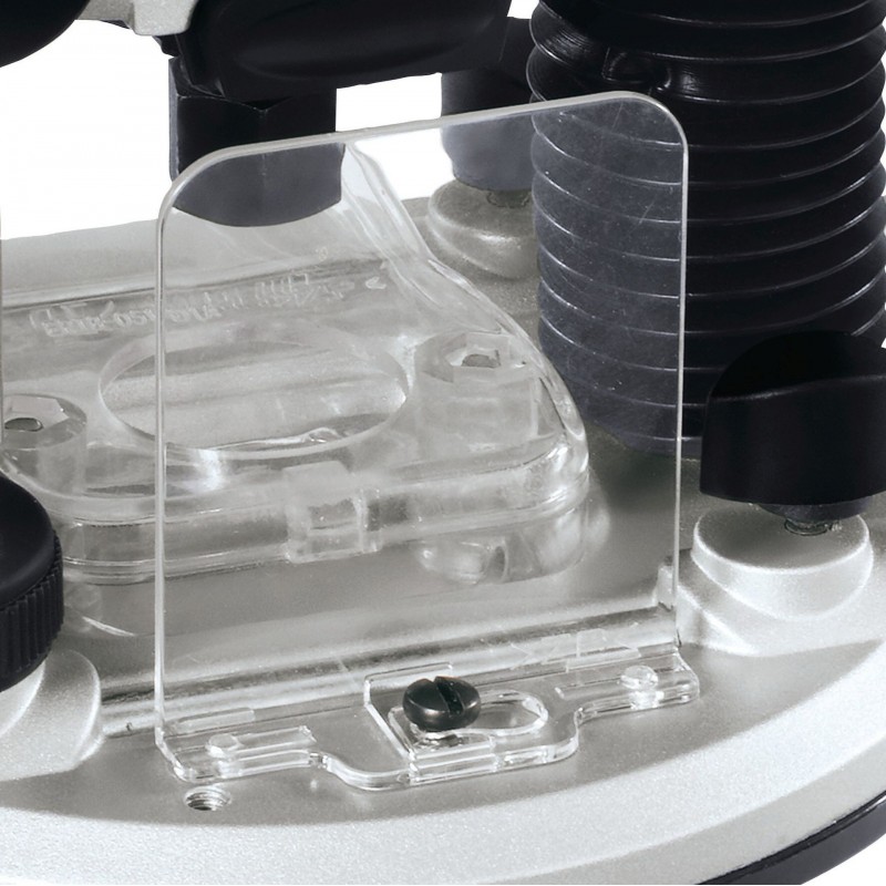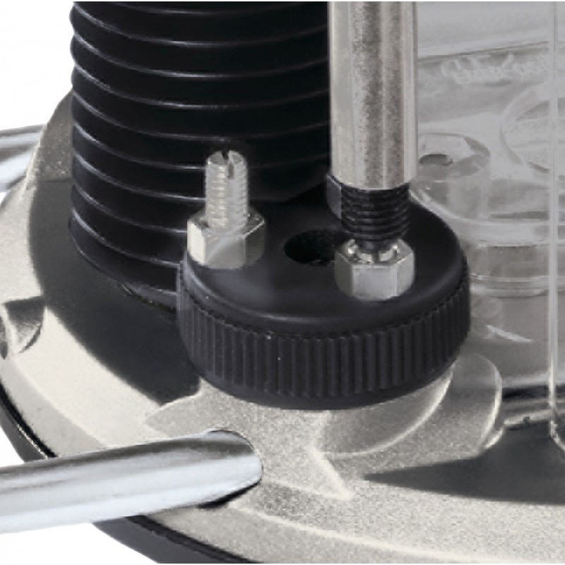 Horní frézka TE-RO 1255 E je vysoce kvalitní, výkonný přístroj, které odborníkovi umožňuje nejnáročnější frézování masivního dřeva, překližky a dřevovláknitých desek. Hloubku frézování lze snadno předvolit pomocí revolverového dorazu a rovněž přesně doladit pomocí jemného nastavení hloubky. Dodatečnou ochranu poskytuje kryt proti třískám. Díky elektronické regulaci lze počet otáček frézky TE-RO 1255 E optimálně přizpůsobit požadavkům materiálu a frézy. Aretace vřetena umožňuje rychlou a snadnou výměnu nástroje, zatímco dobře vyvážená konstrukce zajišťuje stabilitu přístroje. Kleština poskytuje flexibilitu tím, že umožňuje použití nástrojů s průměrem stopky od 6 mm nebo 8 mm. Plastová vložka na podstavci chrání povrch obrobku. Díky ergonomickým rukojetím opatřeným měkkým úchopem poskytuje horní frézka příjemné a bezpečné držení. Po dokončení práce lze přívodní kabel přichytit pomocí kabelového úchytu, přístroj je tak během okamžiku řádně uložen. Dodávku horní frézky kompletují kružítko, paralelní doraz a kopírovací pouzdro.