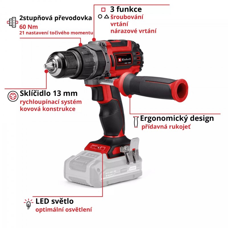 Akupříklepová vrtačka/šroubovák Einhell TP-CD 18/60 li-i Brushless je poháněna bezuhlíkovým motorem Einhell Purepower. Tento bezkartáčový motor nabízí větší výkon a delší dobu chodu než konvenční motory s uhlíkovými kartáči. Pokud je motor Purepower registrován online, je dodáván s 10letým servisním příslibem. Jako člen rodiny Power X-Change lze všechny baterie z řady s vysoce výkonnými lithium-iontovými bateriovými články použít take s TP-CD 18/60 Li-i Brushless. Příklepová vrtačka pomáhá uživateli při práci s odolnými materiály;; příklepový mechanismus poskytuje sílu potřebnou k proniknutí do tvrdého a křehkého materiálu, jako je kámen nebo beton, při vrtání. Pro výkonné řízení a rychlé vrtání má aku příklepová vrtačka/šroubovák také dvoustupňovou převodovku. Funkce Quick Stop umožňuje rychlou a snadnou změnu nástrojů pro použití ve vysoce kvalitním kovovém sklíčidle o průměru 13 mm. Př příklepovém vrtání vznikajíí obrovské síly, což cítí i kutilský nadšenec; přídavná rukojeť proto pomáhá snížit fyzickou zátěž uživatele a ergonomický design se Softgrip zajišťuje pohodlný provoz. Pro dobrý výhled na pracovní oblast, kde je v nových budovách, altánech nebo obtížně přístupných oblastech špatná viditelnost, je k dispozici LED světlo. Tento produkt je dodáván bez baterie nebo PXC nabíječk. Baterie a nabíječky pro řadu produktů Power X-Change jsou k dispozici samostatně.