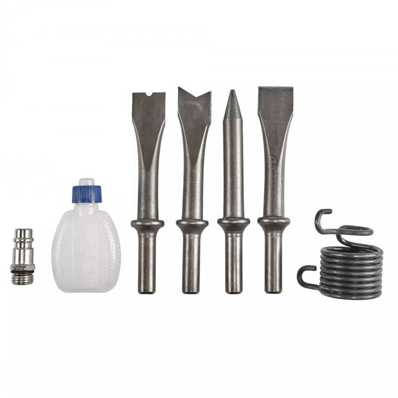 Pneumatické kladivo Einhell TC-PC 45 je výkonným a odolným pomocníkem při zdolávání kamenných nebo kovových materiálů během demoličních a renovačních pracích v domácnosti i mimo ni. Pro bezpečnost práce má protiskluzovou pogumovanou rukojeť s uživatelsky přívětivým designem. Při maximálním provozním tlaku 6,3 bar poskytuje nástroj rychlost zbíjení až 4500 min ^ -1 s nárázovou sílu až 1,2 joulu. Sekáč je bezpečně přidržován šestihranným sklíčidlem. Špičkový výkon nabízí robustní sekací kladivo s hadicí o vnitřním průměru 9 mm nebo více. Díky své univerzálnosti je potenciální využití nástroje takřka neomezené. Balení zahrnuje nejen čtyřdílnou sadu sekáčů o délce 120 milimetrů pro různou řadu aplikací, ale také 1 olejničku, 1 vsuvku a 1 tažnou pružinu.