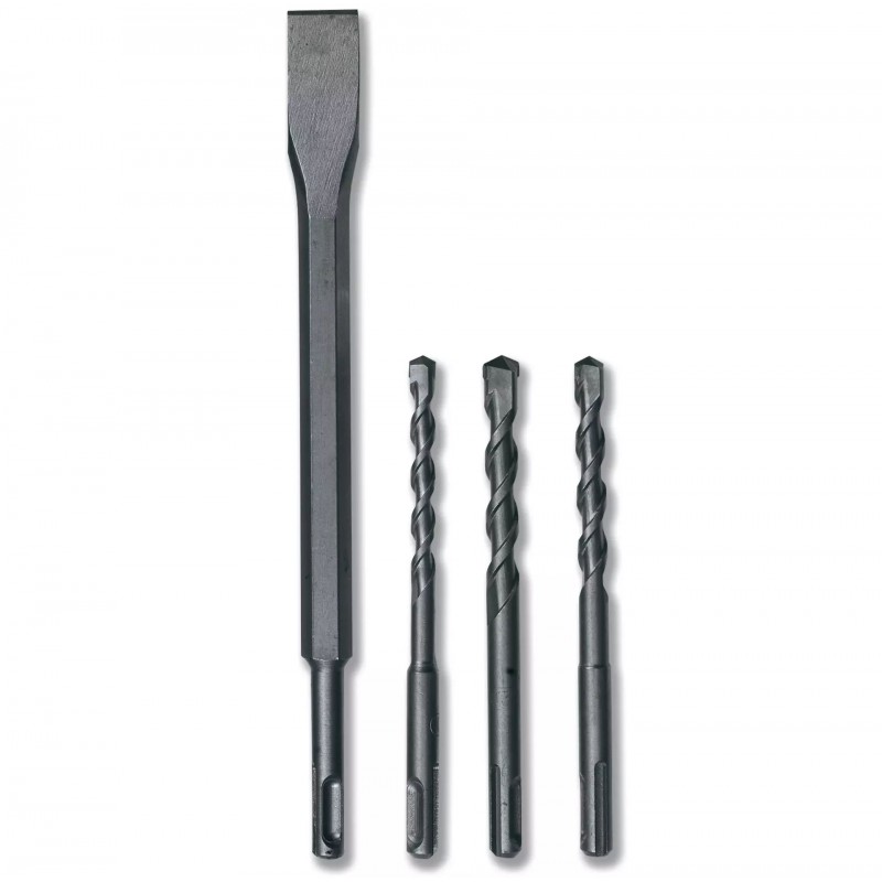 - Včetně 3 vrtáků (O 8, 10, 12 mm) a plochého dláta.