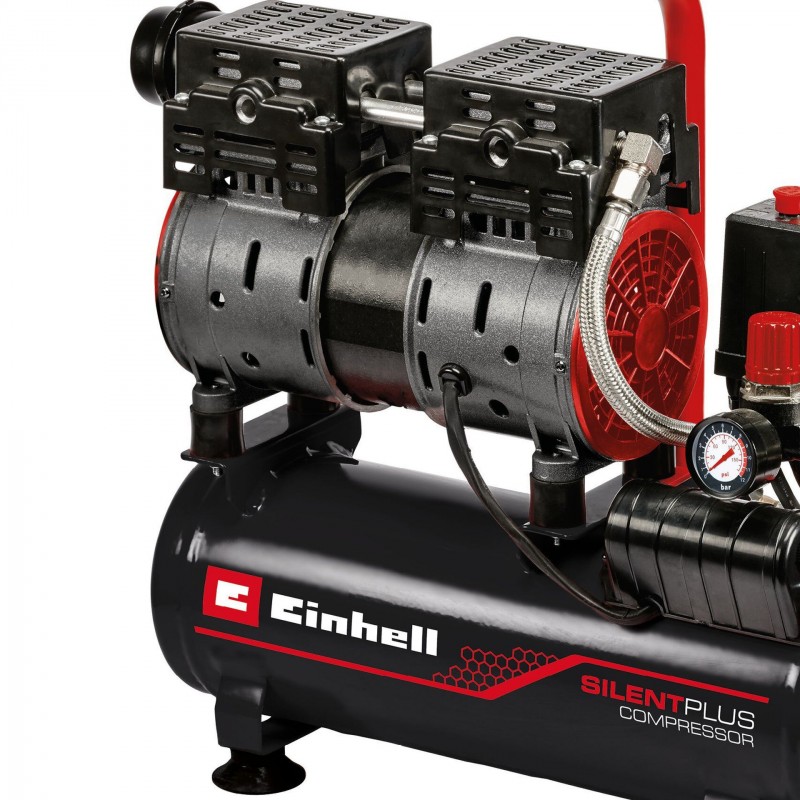 Tichý kompresor Einhell TE-AC 110/6 Silent Plus je multifunkční stroj, který by neměl chybět v žádné garáži nebo dílně. Jednou z vynikajících vlastností tohoto kompresoru je, že generuje méně hluku než 57 dB ( hodnota LpA ). Redukce hluku, ale není vykoupena výkonem kompresoru, což dokazuje motor o výkonu 750 W. Tento kompresor je mnohem tišší než standardní kompresory se srovnatelným výkonem. Motor je bezolejový a díky výpustné zátce je velmi snadný na údržbu. 6 litrová nádrž poskytuje dostatek vzduchu na běžné používání a se správným náčiním můžete kompresor použít k nástřiku barev či laků, nebo k aplikaci konzervačního oleje na dřevo buď selektivně, nebo plošně. Tento všestranný pomocník bez námahy napumpuje pneumatiky jak u aut, motocyklů i jízdních kol, stejně tak míče a nafukovací matrace. Einhell je přesvědčen o kvalitě a nabízí desetiletou záruku na korozi nádrže. K dispozici je redukční ventil pro regulaci tlaku až do 8 barů. Součástí dodávky je manometr a rychlospojka pro řízený pracovní tlak. Pojistný ventil chrání uživatele. Nízká hmotnost produktu a praktická rukojeť zajišťují mobilitu - stačí pár kroků a kompresor je připraven na snadnou přepravu, zatímco stabilitu během používání zajišťují nohy absorbující vibrace.