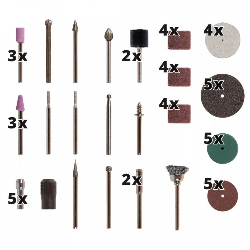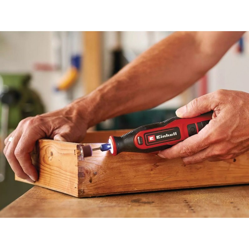 Akumulátorová vysokorychlostní bruska na gravírování Einhell TE-MT 7,2 Li je univerzálním nástrojem pro nejrůznější požadavky při provádění rytí, frézování, broušení a kartáčování při řemeslných pracích v domácnosti, dílně nebo garáži. Elektronická regulace otáček s LED displejem, napájená dobíjecí baterií s dlouhou výdrží (7,2 V | 1 500 mAh), zajišťuje, že nářadí je vždy přesně přizpůsobeno požadavkům každého materiálu a v každé situaci – s rychlostmi 5 500 až 26 000 ot./min. Pro snadnou výměnu nástrojů je k dispozici aretační knoflík. LED světelný prstenec zajišťuje optimální osvětlení obrobku pro efektivnější práci. Ergonomická měkká rukojeť navíc zajišťuje bezpečné uchopení a optimální přesnost. Pro broušení i gravírování je nástroj trvale připraven k použití díky přiložené nabíječce. Výrobek je navíc dodáván také s rozsáhlou 57dílnou sadou příslušenství v praktickém úložném boxu, takže potenciálních využití je nespočet