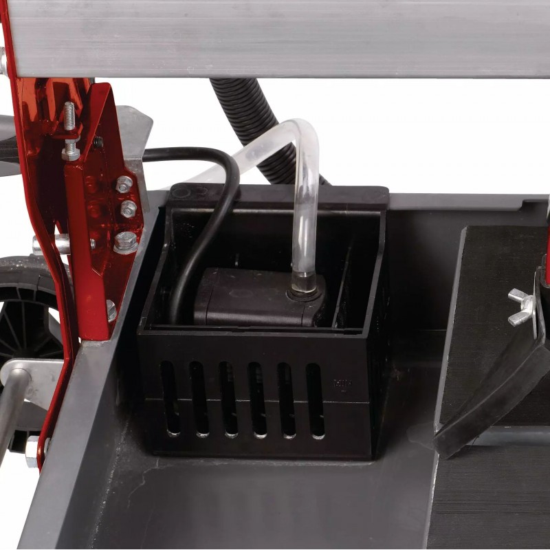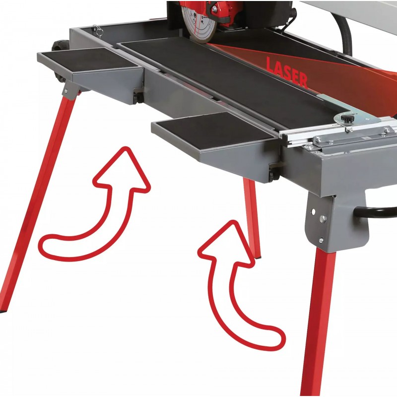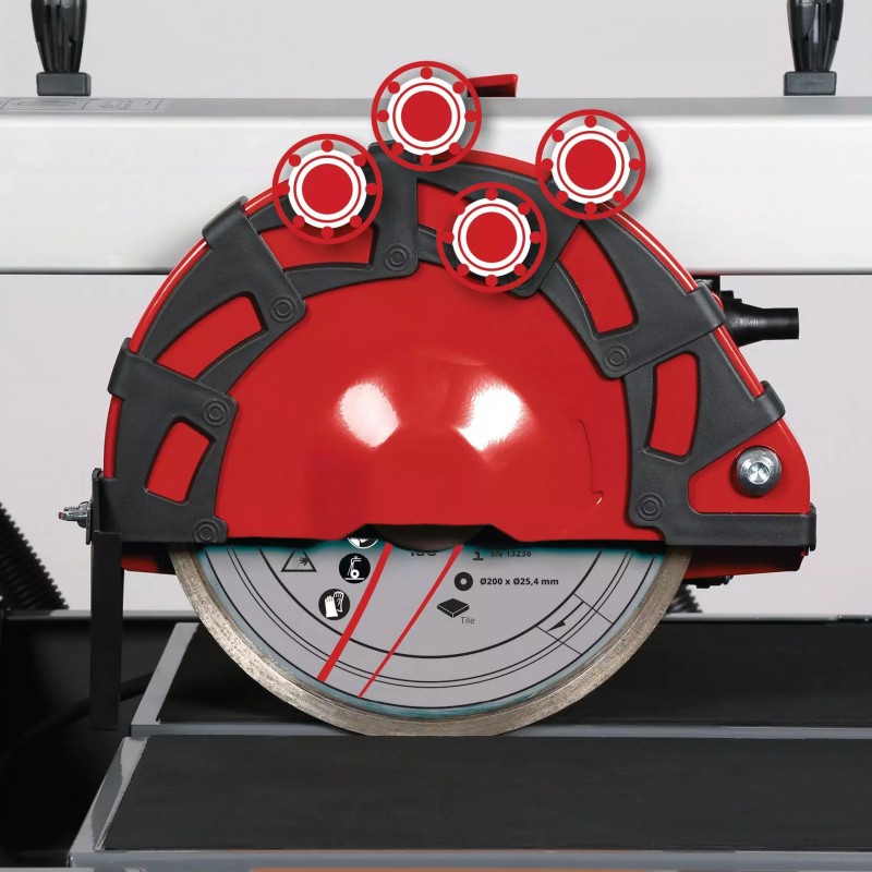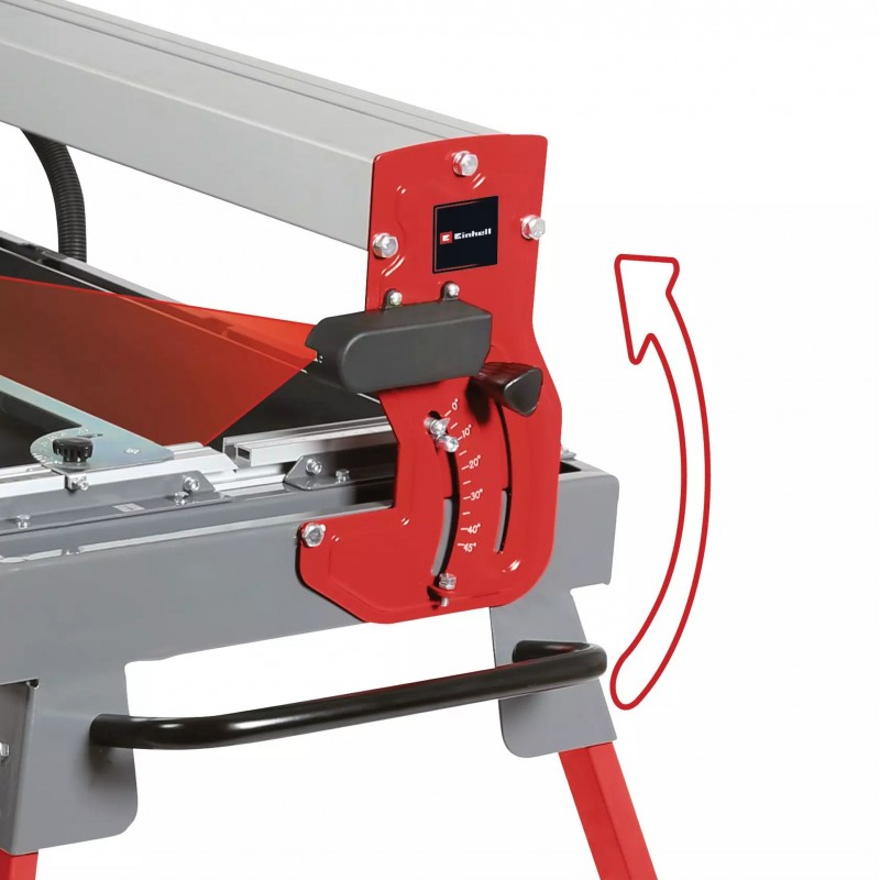 Radiální řezačka dlaždic od firmy Einhell disponuje extra dlouhými řeznými délkami pro moderní velké formáty. Jako optická pomůcka při řezání slouží laser. Posuv motoru vybavený šesti kuličkovými ložisky poskytuje rovnoměrný řez. Přesné vedení hran zajišťuje úhlově přesně nastavitelný úhlový doraz, který slouží jako pevné vedení pro pokosové řezy i dvojité pokosové řezy. Motor je výkyvný až o 45° a je již vybaven turbo-diamantovým řezacím kotoučem s přívodem vody. Vodní čerpadlo s klecí zachytávající nečistoty a omyvatelnými filtračními rohožemi chrání čerpadlo před vnikem větších odštěpků a pevných nečistot. Kromě toho se prostřednictvím integrované filtrace extrahují jemné kovové částice, čerpadlo je tak chráněno i před nimi. Masivní vana pro zachycení vody je vyrobena z ocelového plechu. Řezačka dlaždic stojí na robustním sklápěcím podstavci s funkcí zaklapnutí. Výškově nastavitelná noha může být nastavena na pohodlnou pracovní výšku. Velký pracovní stůl s protiskluzovou gumovou úpravou nabízí sám o sobě přiměřenou pracovní plochu pro menší projekty. Pro zpracování větších ploch jsou jako rozšíření pracovního stolu navíc k dispozici dva dodatečné pracovní stolky. Robustní přepravní kolečka a přepravní držadlo umožňují snadné přesouvání řezačky.