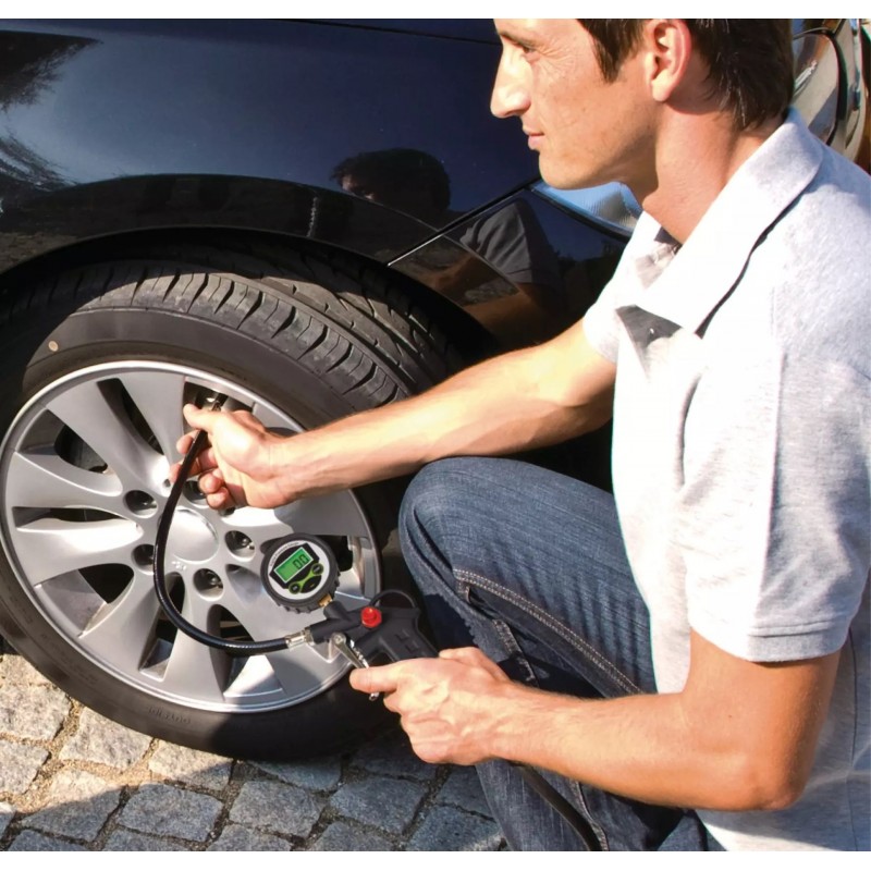 Digitální měřič tlaku v pneumatikách od společnosti Einhell umožňuje snadné a přesné huštění pneumatik. Digitální čtyřmístný indikátor usnadňuje uživateli odečítání hodnoty tlaku při kontrole tlaku v pneumatikách. Pokud je tlak v pneumatikách příliš vysoký, je možné ho snížit pomocí integrovaného pojistného ventilu. Měřič tlaku v pneumatikách, který je určen pro tlaky do 13 barů, umožňuje výběr mezi čtyřmi jednotkami měření. Dodávaná rychlospojka je vhodná pro všechny standardní ventilky pneumatik.