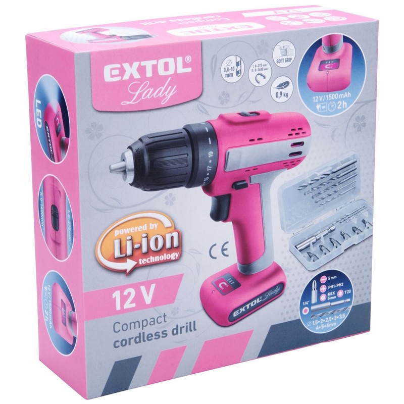 EXTOL LADY vrtací šroubovák aku, růžový, 12V Li-ion, 1500mAh 402402