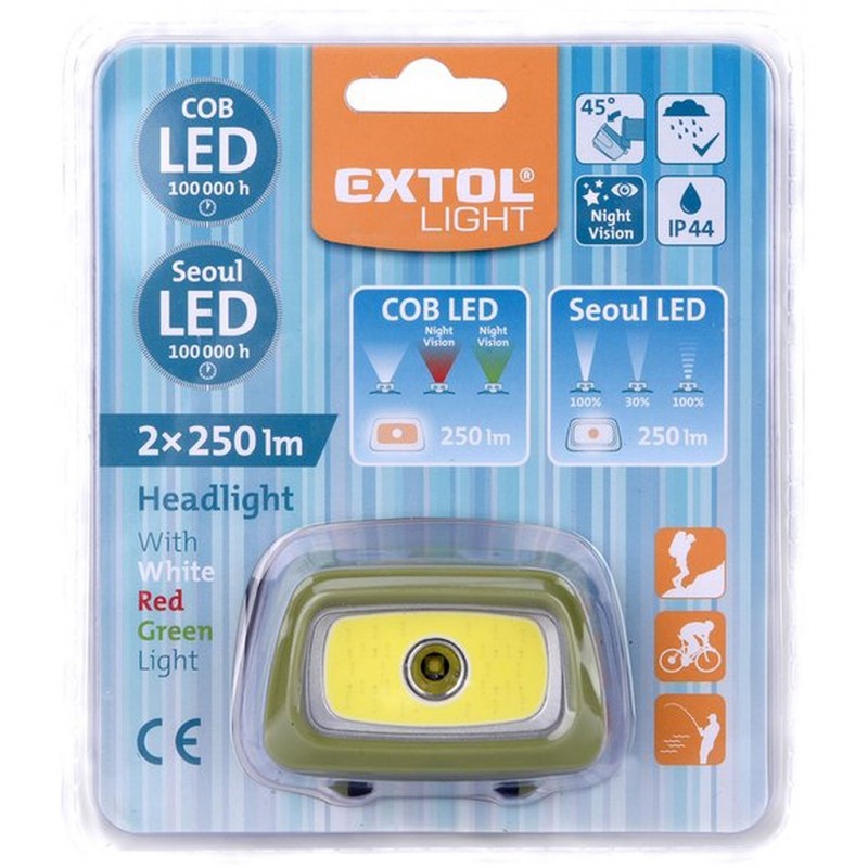 EXTOL LIGHT čelovka 250lm+250lm, 250lm Seoul LED, 250lm COB LED, červené/zelené světlo pro noční vidění 43108