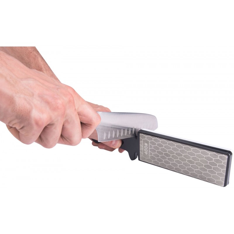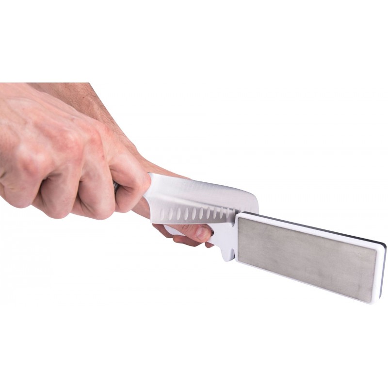 • oboustranný brousek s diamantovým prachem o hrubostech P400/P1000 je doplněn plastovo-keramickým vodičem, který při broušení napomáhá lepšímu udržení konstantního sklonu čepele nože vůči brousku