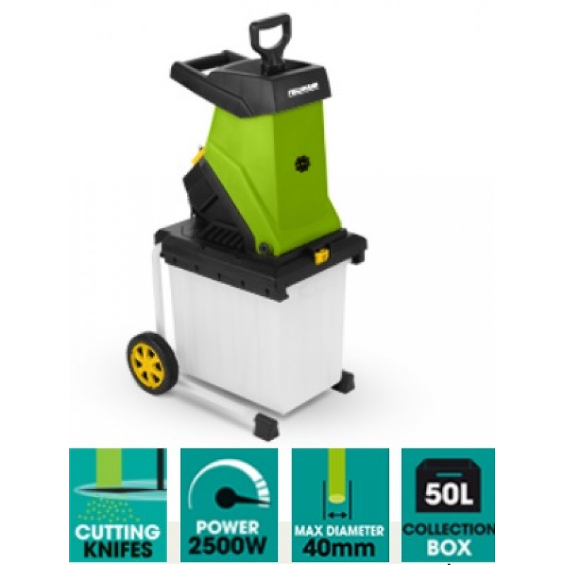 Elektrický drtič s příkonem 2 500 W je opatřen tepelnou pojistkou, která zabraňuje přetížení a následnému zničení stroje. Nedílnou součástí je plastová nádoba, díky které je manipulace s drtí výrazně snadnější. Tento model umožňuje drtit větve do průměru 4 cm. Ocelový rám zvyšuje stabilitu při práci a tím napomáhá bezpečnému používání stroje. Součástí dodávky je také plunžr pro bezpečný posun zbytků materiálu k nožům.