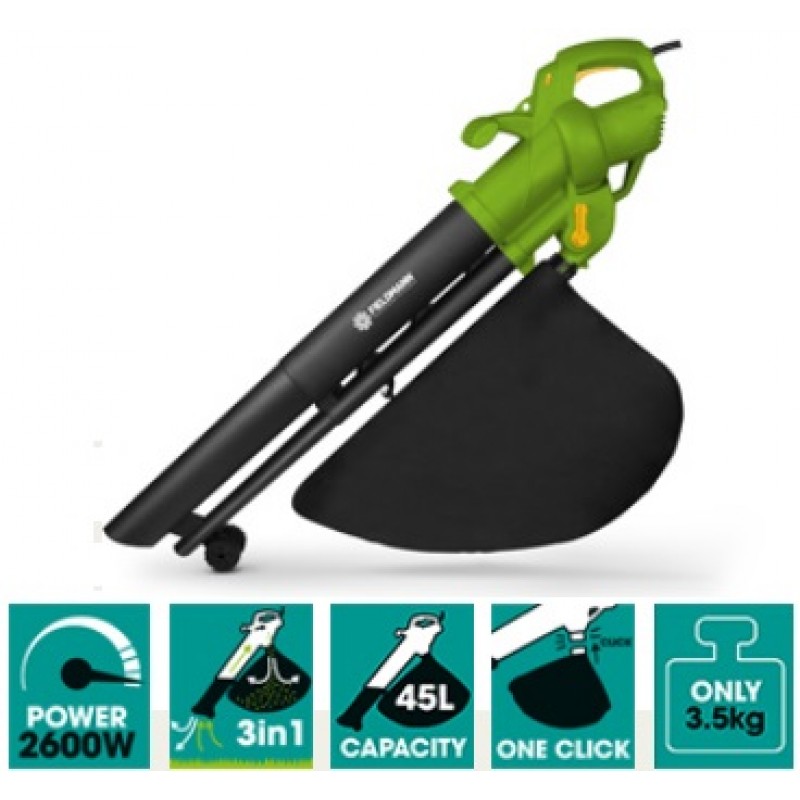 Zahradní vysavač s příkonem elektromotoru 2600W a s možností plynulé regulace výkonu. Tuto funkci oceníte zejména při úklidu listí z povrchů pokrytých mulčovací kůrou či kačírkem. Výkon jednoduše nastavíte tak, aby jste nasáli či odfouknuli jen zpravidla lehčí listí a ostatní materiál zůstal na místě. Vysavač samozřejmě i drtí nasátý materiál, čímž dochází k desetinásobnému snížení objemu. Rozdrcený materiál lepe zetlí a je také vhodnější pro kompostování. Pro pohodlnou práci na větších plochách lze využít opěrné kolečko a ramenní popruh, který je součástí baleni.