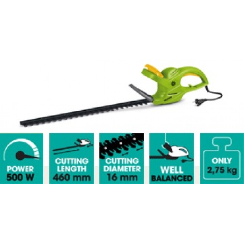 Oblíbené a cenově dostupné plotové nůžky s příkonem motoru 500 W a lištou o délce 460 mm. Tento model je umožňuje střih větví až do průměru 16 mm. Ke standardní výbavě patří bezpečnostní brzda a systém dvojitých bezpečnostních spínačů, které zamezují nechtěnému samovolnému sepnutí motoru.