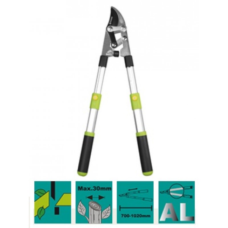 Teleskopické nůžky na větve se smykovými stříhacími čepelemi, které dokáží ustříhnout větve hravě do 30 mm. Komfortu stříhání velmi pomáhá délka nůžek 700 až 1020 mm a také jejich nízká hmotnost díky rukojetím ze slitiny hliníku. Ergonomické úchyty s pogumovaným povrchem zaručí neskluznost i námahou vlhčích dlaní.