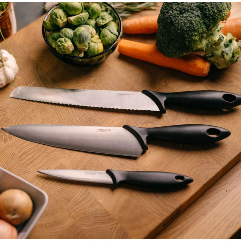Startovací sada FISKARS Essential 3 nožů 1065583 je kompletní základní výbava pro každou kuchyni. Obsahuje tři nejpoužívanější nože – masivní kuchařský nůž 21 cm, okrajovací nůž 11 cm a nůž na chléb a pečivo 23 cm s pilkovitým ostřím. S touto sadou zvládnete všechny základní kuchyňské práce od krájení masa a zeleniny až po okrajování ovoce a krájení chleba.