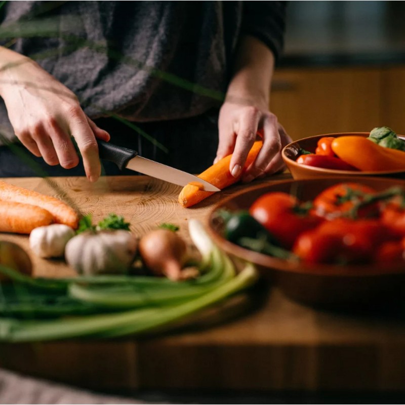 Velká zarážka prstů pomáhá minimalizovat riziko sklouznutí na čepel a použité materiály umožňují bezpečné krájení i mokrou nebo mastnou rukou. Dobře vyvážený a ostrý nůž umožňuje přesnější řezy a usnadňuje každodenní přípravu potravin.