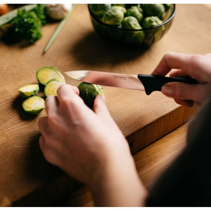 Sada FISKARS Essential obsahuje tři specializované nože – loupací nůž, okrajovací nůž a snídaňový nůž s pilkovitým ostřím. S touto sadou zvládnete všechny práce od loupání a okrajování až po krájení rajčat a dalších potravin se slupkou.